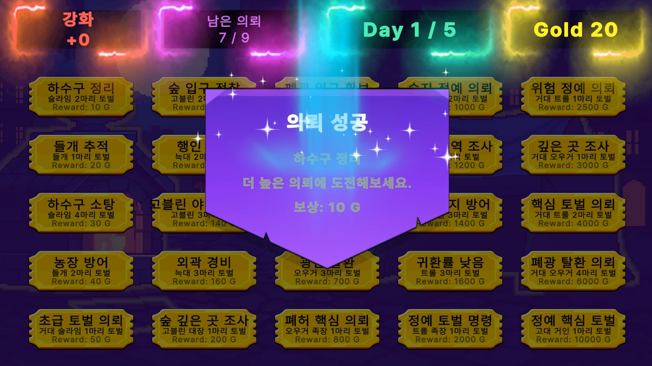 5일 동안 의뢰를 수행하고 무기를 강화하세요.